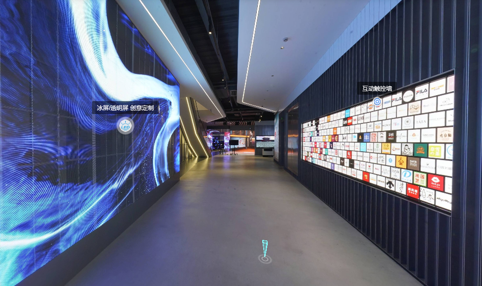 观众可以第一视角沉浸式漫游体验展厅场景,身临其境的感受展厅环境,查看展项与展品。虚拟展厅内所有展项、展品均进行了名称标注,且集成产品资料、方案、案例、视频介绍等内容,观众可点击查看,自助参观。